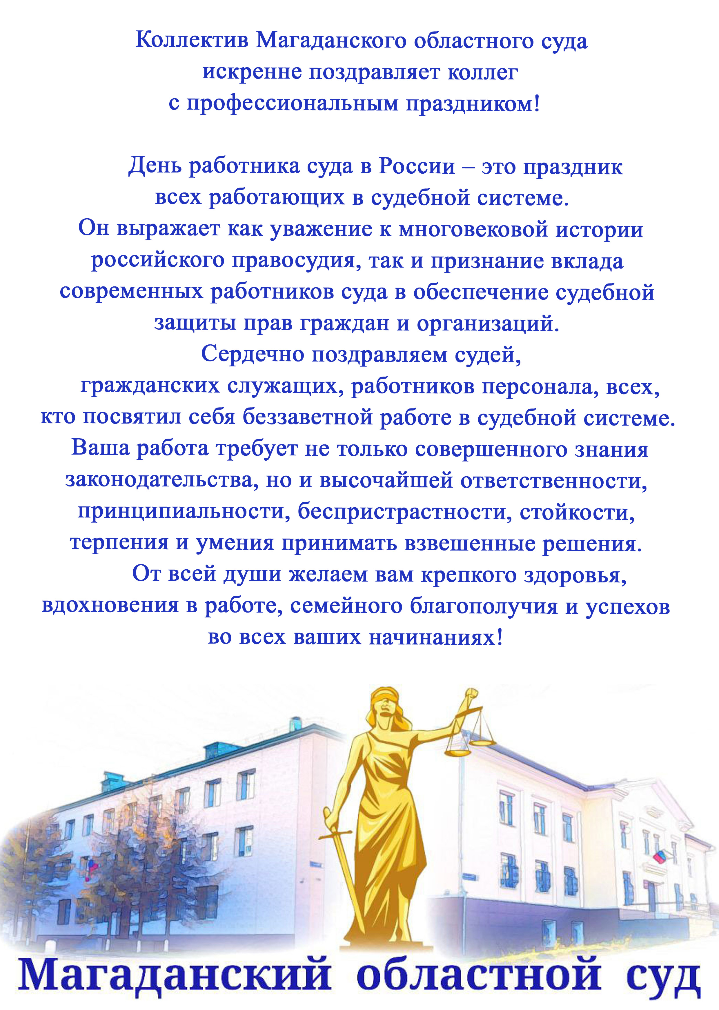 | Магаданский областной суд поздравляет коллег с профессиональный праздником - Днем работника суда! | версия для печати |